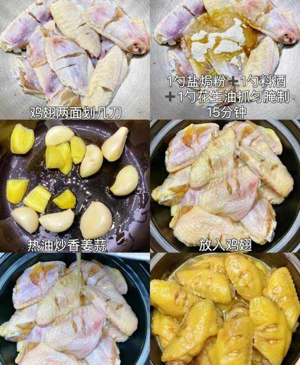2、砂鍋少油,放入幾瓣蒜,幾塊薑,炒香,再放入雞翅,倒入剩餘醃汁,蓋上鍋蓋,中火悶15分鐘即可出鍋瞭!