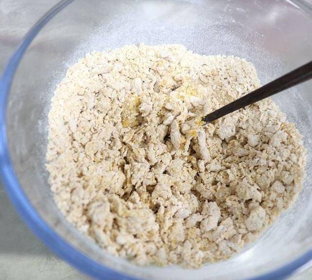 第6步、用筷子攪拌成絮狀,盡可能多攪拌一會兒,可將南瓜泥與面粉充分混合,面絮底部沒有明顯的幹面粉。