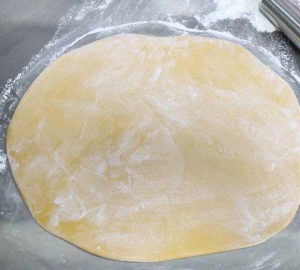 第9步、案板上撒少許面粉,將面團搟成厚約3-5毫米的面片,厚度決定瞭面條的厚度和口感,根據喜好來調整薄厚度。