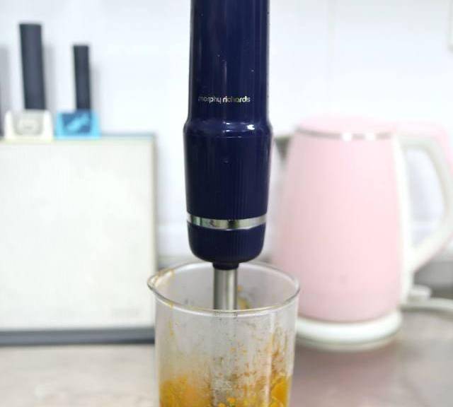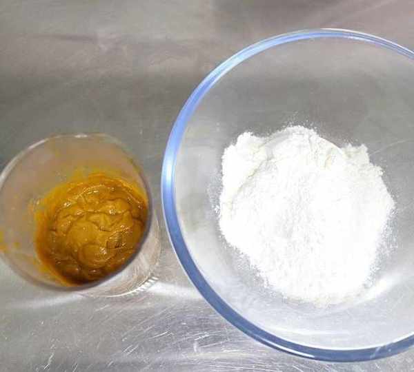 第5步、面粉的吸水率和南瓜的稀稠度不一樣,先按面粉量的60%來添加南瓜泥;手搟面需要面團硬一點,所以看面團狀態再適量添加南瓜泥。