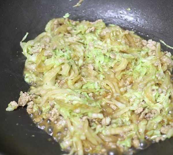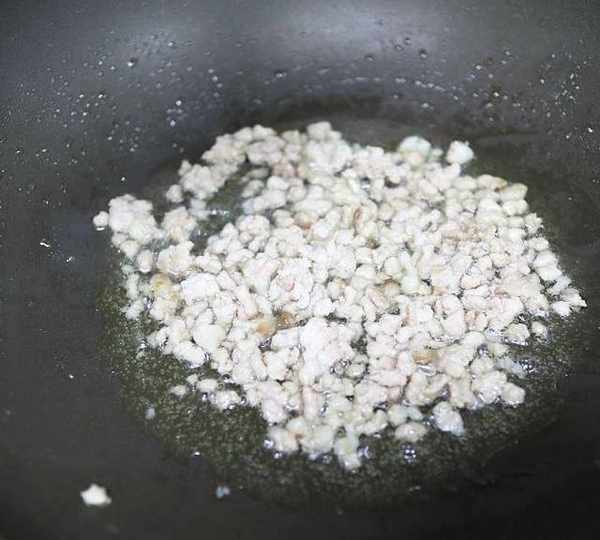 第17步、炒鍋中倒適量油,先將肉餡煸炒變色。