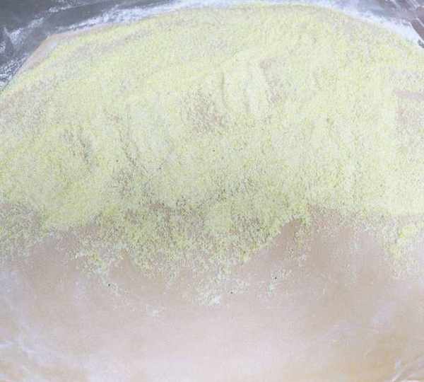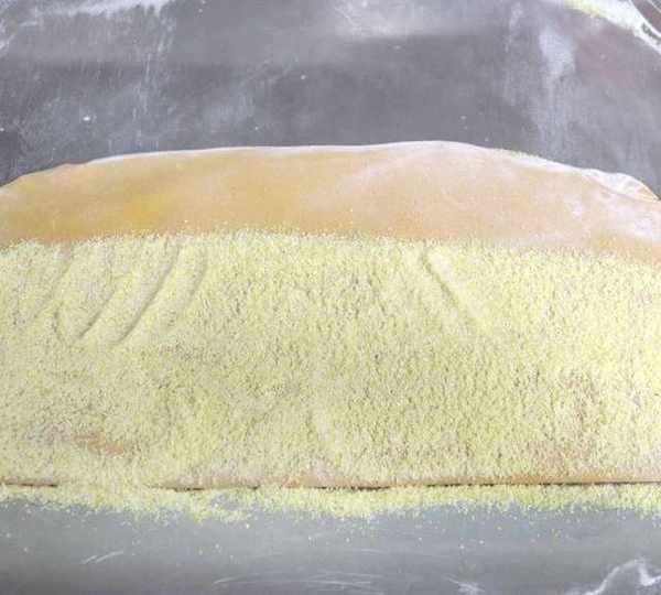 第12步、對折後再在一半的面片上鋪撒玉米面。