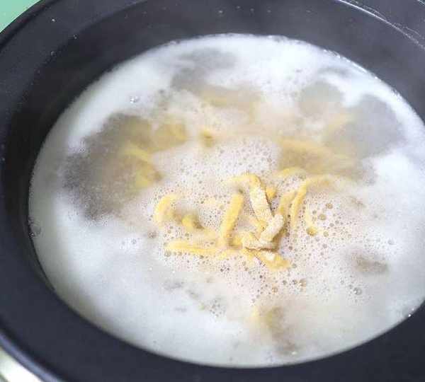 第19步、炒菜的時候燒水,水開後將面條入鍋中,大火煮熟。