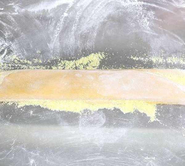 第11步、在一半的面片上鋪撒細玉米面;玉米面顆粒比面粉大,既吸潮又增加面片間的空氣流通,可防止面片和面條粘連。