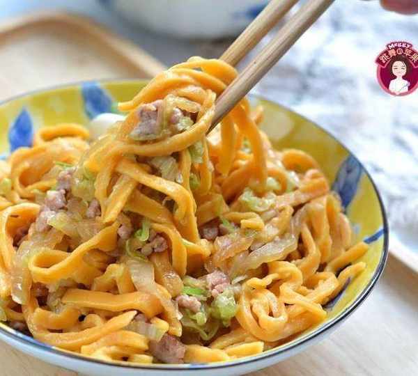 今天的南瓜美食是南瓜手搟面,一根根,一條條,“白嘴兒”吃幾根,筋道有甜味。這甜味即有南瓜的甜味,也有面粉在口中咀嚼後的甜味。平時都先吃菜,竟然忽略瞭這天然的味道。南瓜大豐收,因此我傢冬天的三餐中都將出現南瓜元素,金燦燦的如一縷陽光,眼亮瞭,胃暖瞭,體壯瞭,真是一道治愈系的手搟面。