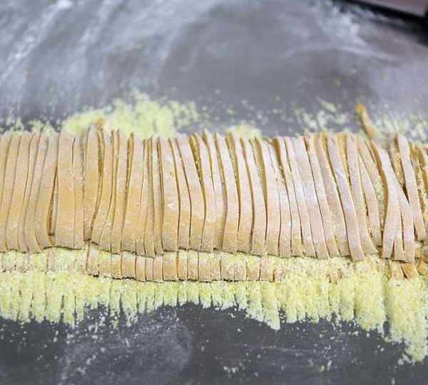第14步、用利刀將面片切成面條,寬度隨自己的喜好,可寬可細;面條和玉米面一起搓起來放在端盤裡,表面用玉米面覆蓋或者蒙保鮮袋防幹。