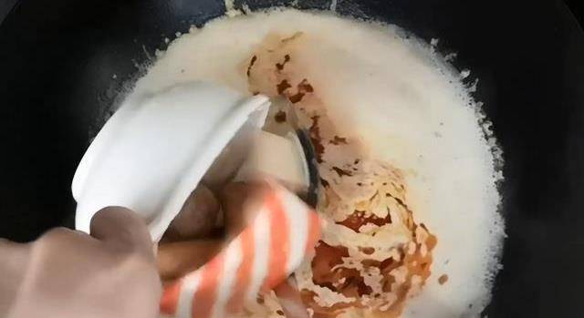 蒜末炒香後,鍋中倒入一袋牛奶,覺得牛奶味太濃的,可以在鍋中放入少量清水,燒開後,我們先把不太容易煮熟的丸子放入鍋中煮開