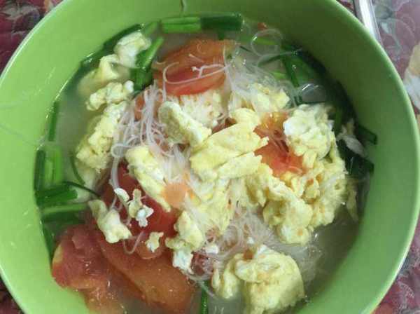 番茄雞蛋米粉:鍋內放入適量的食用油開火加熱;待油溫達到六成左右,倒入雞蛋液,待雞蛋渡開始凝固時,用筷子快速攪拌雞蛋液取出;鍋內加水放入番茄片、雞蛋開大火煮開;水開後放入米粉幹煮熟;加入食用鹽、蔥花拌勻即可。