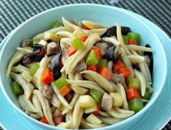 鮮蔬剪刀面:水加入面粉中,一點點加,邊加邊用筷子攪拌成雪片狀,用手揉成面團,放容器裡蒙保鮮膜醒30分鐘,醒好的面團,再次揉和成光滑圓錐型面團,鍋中水燒開,放一小勺鹽,用剪刀邊剪邊轉動面團,全部剪到鍋中,煮至剪刀面全部浮起,把煮熟的剪刀面撈出用涼水沖涼瀝幹,剪刀面就做好瞭。
