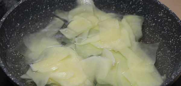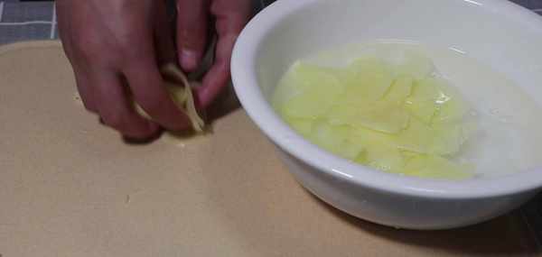 削好的土豆片放在一盆清水中,清洗掉土豆中多餘的淀粉,吃起來會更加爽脆。也能夠防止土豆的氧化。