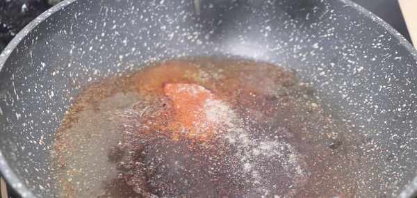 接著起鍋熱油,油熱之後放入適量的花椒將花椒炸出香味,然後撈出棄之不用。就是在油中加入少量的孜然粉。,再加入一些辣椒粉。加入一些白胡椒粉,火一定要調至最小。然後再加入一點食鹽。立馬關火,攪拌均勻。
