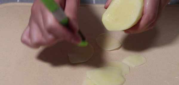 我們準備一兩個土豆,削皮之後呢,清洗幹凈,我們可以用刀自己切成薄片,也可以用削皮刀削成薄片,這樣吃起來會更爽脆,當然也會更均勻,口感更好。