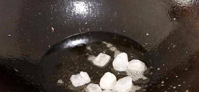 鍋內留底油,下冰糖炒糖色,待糖炒至深褐色開始冒泡泡的時候,加清水。