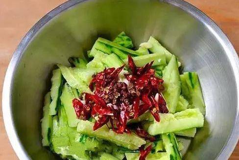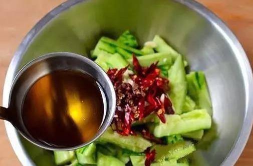 黃瓜比較清脆多汁,所以很容易就會被拍碎,拍碎之後剁成小塊兒。切的時候盡量斜著切成滾刀狀,這樣可以增加接觸面積,涼拌的時候會比較入味,然後把黃瓜放在盤子裡面。加入炸香的幹辣椒,少量的花椒,食用鹽,雞精,料酒,再加入一勺生抽。生抽可以多放一些,味道會更好,沒有醋,有生抽就可以瞭。然後鍋中加入少量的食用油,油燒至5成熱,把熱油用勺子舀出來,慢慢潑在黃瓜上面,攪拌均勻就可以吃瞭。