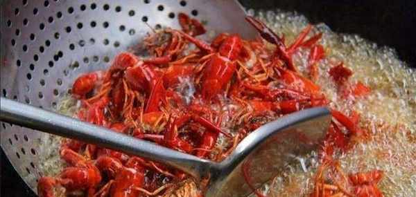 2.青瓜切成小塊,青紅椒切成丁,準備好香料配料和調味料備用。鍋裡熱油6成時,把處理好的小龍蝦倒入,炸制2分鐘左右,撈出控油待用: