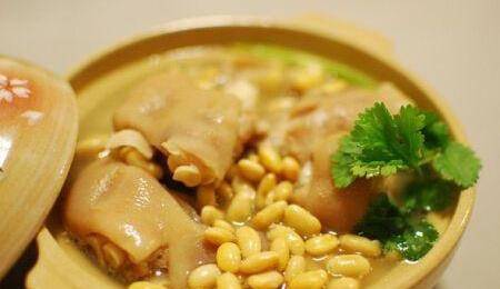 做豬腳對黃豆所需要的食材分別為:豬腳飯汁,黃豆100克白酒一小瓶蓋,食用鹽適量,胡椒粉適量。制作方法:首先,把所有的食材準備好。,豬腳選擇前豬腳這裡的肉比較多,而且沒有太大的異味。把豬腳上面的雜質清掉,這樣比較方便清洗。接著,把黃豆提前泡上。如果有時間的話可以前天晚上就泡上,第2天再清洗一下,方便煮。其次,把洗好的豬腳冷水下鍋,加入白酒,生薑絲,大火燒開轉為小火,用勺子撈出浮沫,再把泡好的黃豆胡椒粉全部放進去,蓋上鍋蓋,小火慢慢燉煮,直到用筷子可以輕松紮透,黃豆煮得比較軟綿就可以瞭。整個過程大概需要一個半小時。最後,煮好之後加入適量的食用鹽,用湯勺充分的攪拌均勻,就可以盛出來開動瞭。