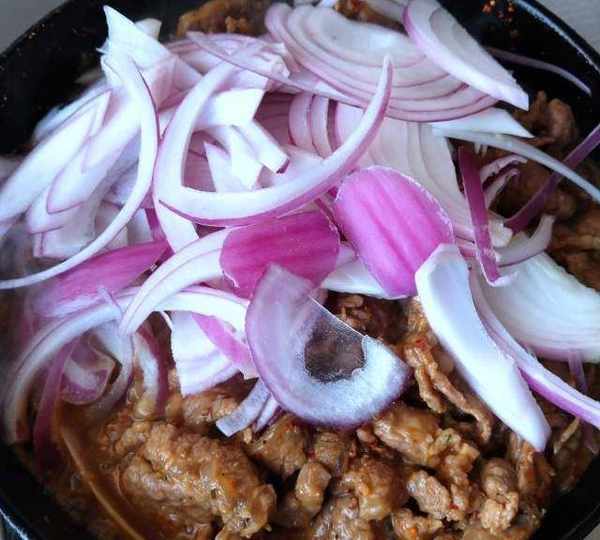 第10步、先把洋蔥絲放入。