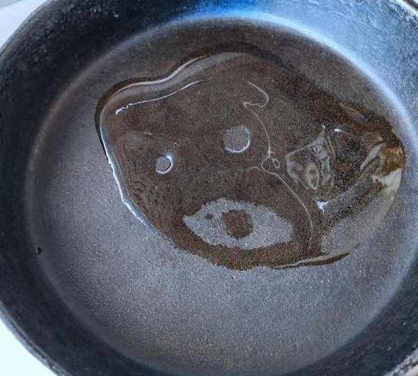 第6步、厚的鑄鐵鍋燒熱,倒入油把鍋底全部潤油就不會粘鍋。