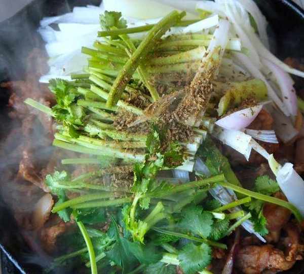 第12步、放入蔥絲和香菜梗,再撒一次孜然粉,翻炒均勻。