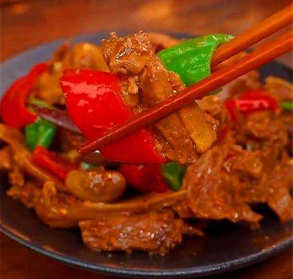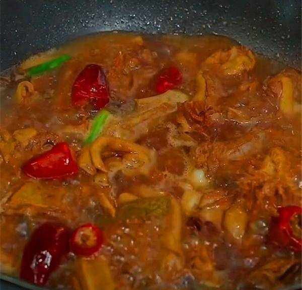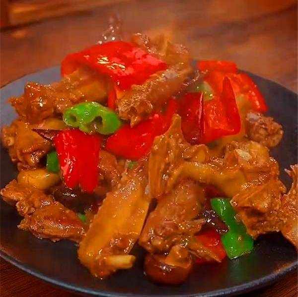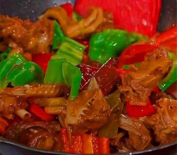 等時間到瞭開蓋放入香菇,繼續燜十分鐘,最後放入青紅辣椒,用大火收濃湯汁就可以出鍋瞭。