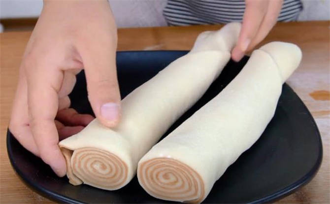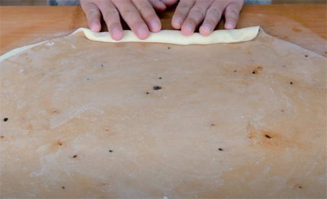 5.把兩張餅皮摞在一塊,上面刷一些水,然後從一端卷起來。