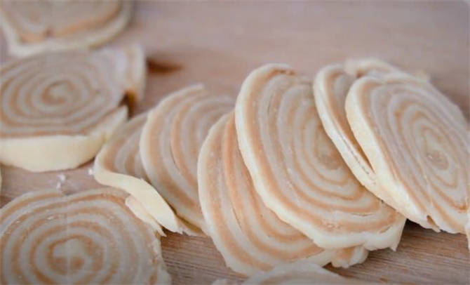 6.用刀切成兩半,現在面團有點軟不好切,放在盤子裡,然後放到冰箱冷凍一個小時。