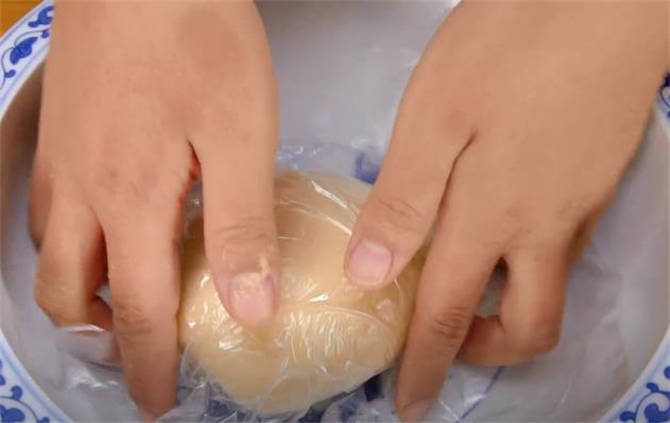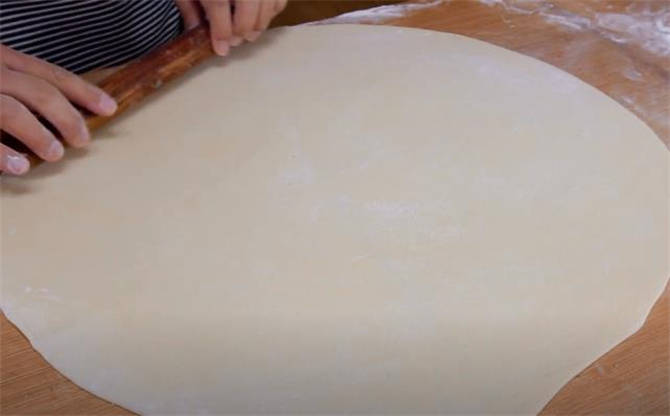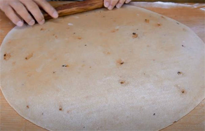 3.現在劑子已經餳好瞭,案板上撒一些幹粉,搟成一張薄的餅皮。
