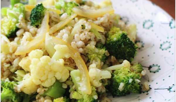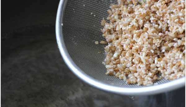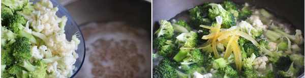 將白綠花椰菜直接倒入煮小麥的鍋子裡,放入鹽漬檸檬皮。