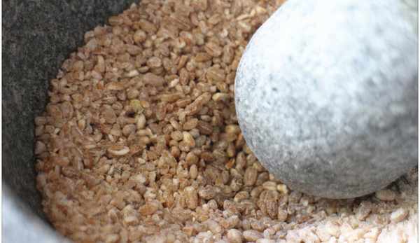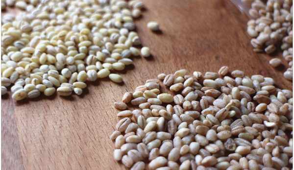 右下方是姐姐分享給我的有機小麥,右上是珍珠麥,兩者相似度高達99%,貼心註解:珍珠麥就是去糠的大麥。boulgour,或稱bulgar就是省錢上菜的碎麥粒或療愈食物的佈格麥,即小麥經預煮幹燥,再略為去除麩皮的谷類食品,傳統是由雙手摩擦去麩皮,麥粒因而碎裂,如今皆以機器代勞。