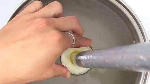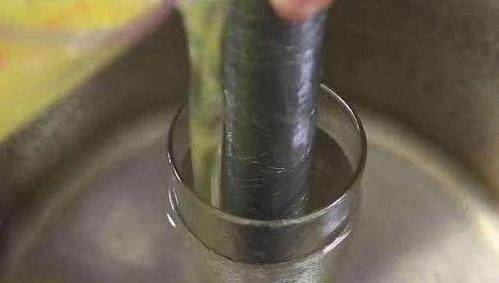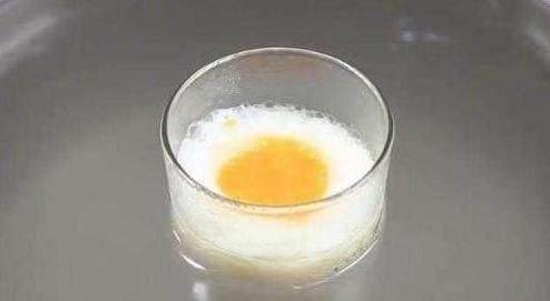再準備一個長玻璃杯,在杯壁上刷上少量油,馬上把細圓筒放進去,然後把蛋清倒進玻璃杯裡,把整個東西放在一個有水的鍋裡,把水燒開。記得把它握在手裡,不要松開。
