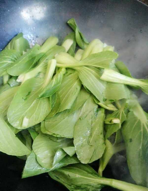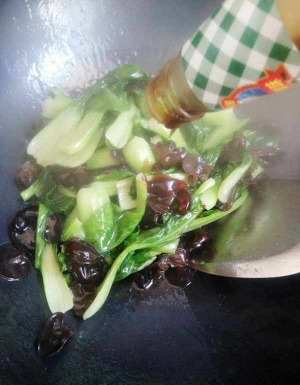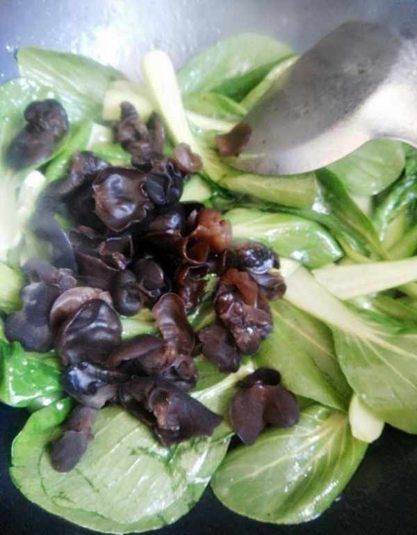第三步:燒熱鍋,放入油。油熱後,將洗凈的白菜放入鍋中攪拌至白菜變軟,然後將幹香菇連同白菜一起倒入鍋中。可以撒少許鹽,不停的攪拌,這樣可以讓蔬菜更軟更入味,等湯稍幹的時候更好吃,然後把蠔油倒入鍋中,不停的翻炒,蠔油可以讓這道菜比較好吃。