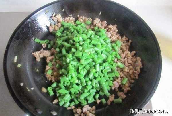 鍋裡放少許油,油稍微燒熱,然後放入蒜頭爆香,然後把肉放入之前醃好的肉一起炒。炒的時候要把肉稍微攪動一下,把肉攪散,炒出肉末的香味。待肉煮熟變色後,撈出備用。鍋燒熱,油不夠就再加一點,然後把切好的豇豆放進去炒。