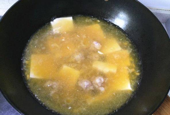 第三步:接下來,你可以加熱鍋。加熱後,加入少量食用油。當油溫升至80%熱時,將切好的南瓜塊放入鍋中煎。攪拌幾次後,倒入少量水,用大火將水燒開。水開後,將切好的豆腐放入鍋中煮沸。待豆腐快熟時,將拌好的南瓜糊倒入鍋中。
