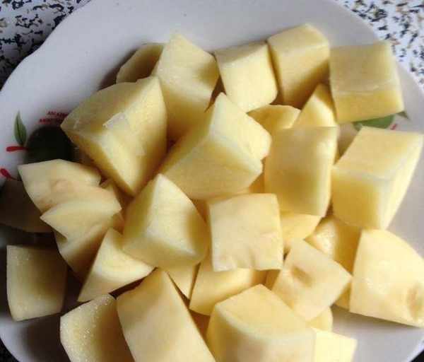 然後將土豆用清水沖洗幹凈,去皮,切成小塊,用清水洗凈。為什麼喝水?因為如果去皮的土豆不泡水,直接放在碗裡,土豆表面很快就會氧化變黃。因此,土豆一定要切成小塊,用水泡一下。
