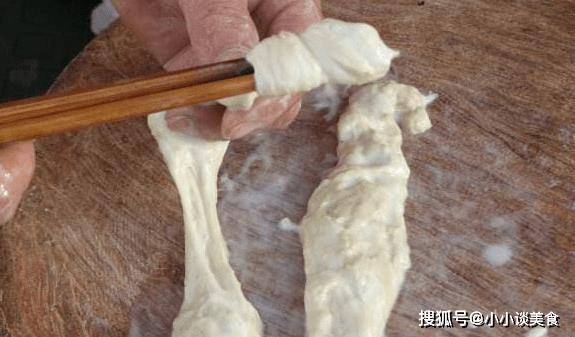 冷卻後,用棍子一根一根串起來,然後用小刀在面筋上劃一道斜刀,看起來和外面賣的面筋一樣。