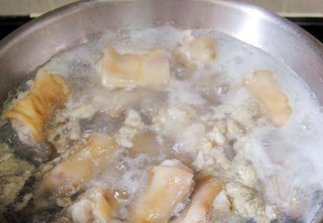 2、豬蹄焯水後,放入鍋中過冷水。隨著溫度的緩慢升高,他們體內的血液才能被逼出來。豬蹄焯水的時候要註意用勺子攪動,防止豬蹄粘鍋底。漂燙後註意用熱水沖洗;