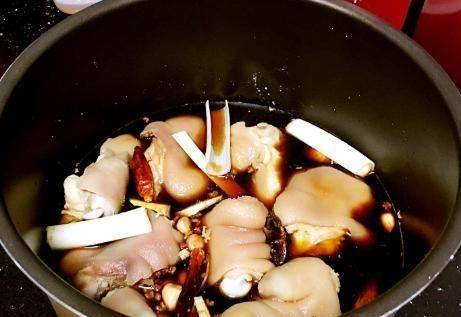 替代食材:豬蹄2隻、生菜1條、白糖2克、醬油50克、薑5片、幹紅辣椒5個;