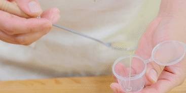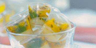 百香果切去頂部,用小勺把果肉挖出來。