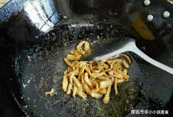 還有一種方法,就是先把肉絲炸一下。很多人在飯店做菜的時候都是用這種方法,就是先把切好的豬肉沾上淀粉,然後再炒。不會粘鍋,炒手撕肉的時候可以用這個方法。