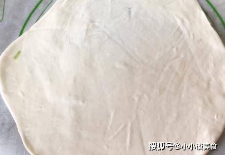 第五步,將切好的面片朝中間疊放,再次搟成圓形,放入烤盤中,開始小火烘烤。兩面焦黃後,抹上醬汁,撒上蔥花,切丁即可食用。