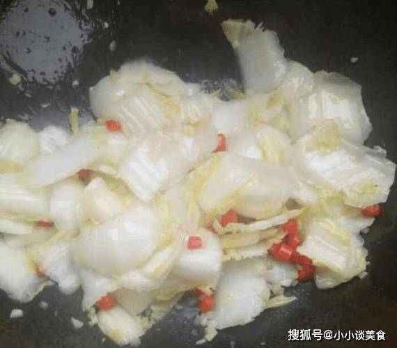 這道菜,味道最好用白菜心做,但浪費瞭一整顆白菜。我們將卷心菜掰開,清洗幹凈,切成小塊,將卷心菜和葉子分開,晾幹。將辣椒和大蒜切碎,然後在鍋中加入油,放入辣椒和蒜末翻炒。出香味後,放入白菜翻炒。