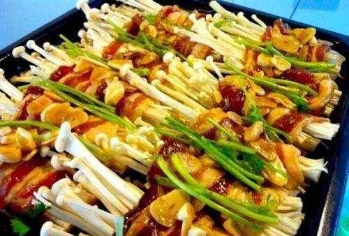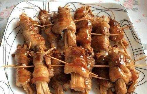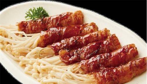材料:五花肉片300克,金針菇1包,鹽適量,味精少許,生粉水少許