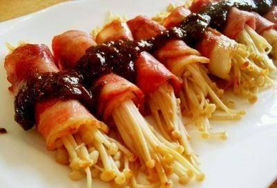2、金針菇洗凈。取一些金針菇,裹上五花肉薄片,最後抹上少許生粉水,使五花肉片粘在一起。