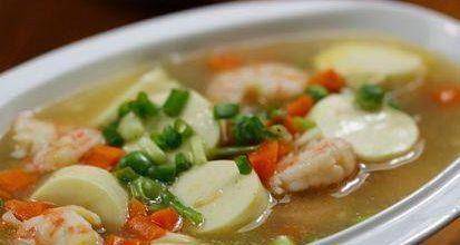 一、準備好所需材料:蝦、胡蘿卜、豆腐、油、鹽、薑、洋蔥、生粉、檸檬汁
