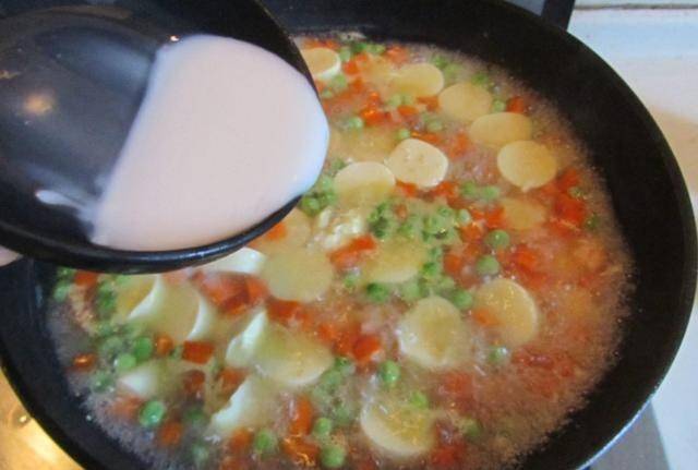 第四步:鍋內食物煮熟後,轉小火至大火,煮約1分鐘後,將玉米淀粉加水勾芡,撒上鹽。在烹飪過程中註意這一刻。邊做邊攪拌,以免在鍋中結塊!出鍋後撒上香菜,就完成啦!