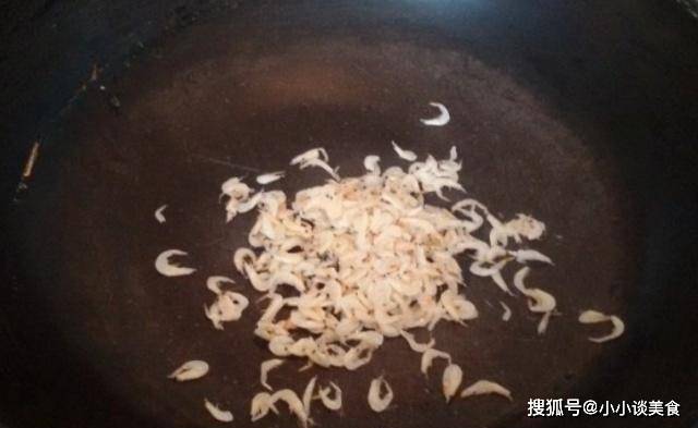 第三步:準備好所有的材料後,就可以加熱鍋瞭。鍋中水燒幹,水開後放入蝦米,常火將蝦皮炸熟,炸好後撈出蝦米。鍋裡倒入足量的油,等油熱瞭,再把雞蛋倒進鍋裡。