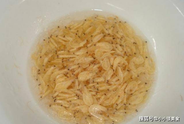 第一步:準備一個盤子,把買回來的蝦米放在盤子裡,倒少許水泡一下。將蝦米浸泡約5分鐘,用水沖洗兩遍,撈出備用。