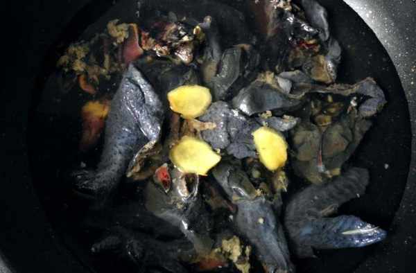 步驟三:鍋內放清水,烏雞冷水下鍋,放幾片生薑,一勺料酒,焯水後撈出。