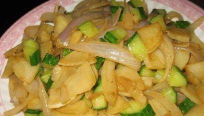 5.加入高湯、黃酒、鹽、金針菇、豌豆苗和黃瓜片,快速攪拌。當所有食材都煮熟後,將它們放在盤子裡。