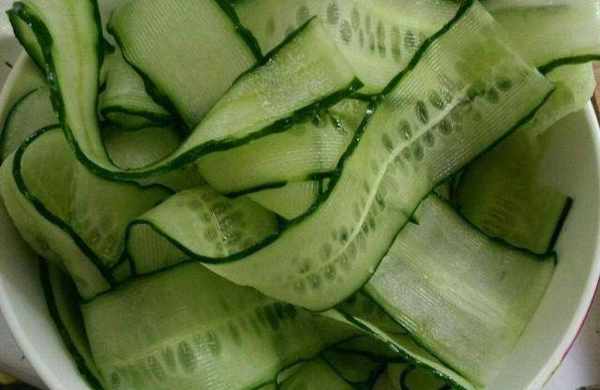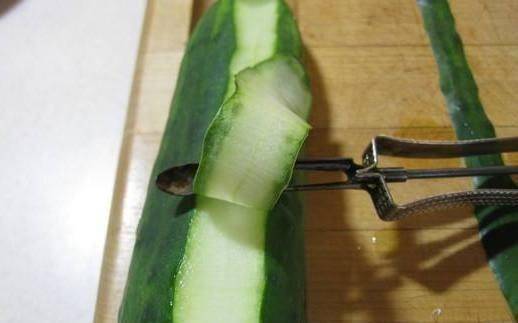 首先我們準備黃瓜,將黃瓜清洗幹凈,然後去掉頭和尾。然後把黃瓜稍微清洗一下,用刀在黃瓜表面刮下三道,簡單的把黃瓜的皮剝掉一些。然後使用黃瓜切片部分,將黃瓜平放,用切片刀將黃瓜從頭刮到尾,將黃瓜磨成又細又長的片。黃瓜皮的長度和黃瓜差不多,但是要薄很多,不然太厚瞭就不好吃瞭。